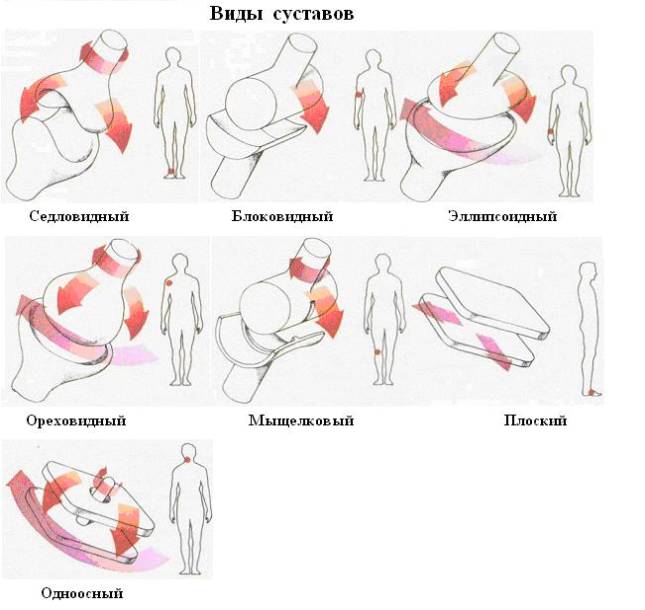 Кости соединяются друг с другом неподвижно (непрерывные соединения) и подвижно (прерывные соединения, или суставы). Между ними имеется переходная форма - полусустав. К непрерывным соединениям относятся соединения при помощи соединительной ткани (синдесмозы), хрящевой ткани (синхондрозы), костной ткани (синостозы). Одной из разновидностей синдесмозов являются связки - коллагеновые и эластические. Тип соединения костей определяется действием механических факторов. Преобладающую роль играет фактор движения. У лиц с сильно развитой мускулатурой отсутствует полное разгибание в локтевом суставе. Это связано с чрезмерным развитием локтевого отростка и функциональной гипертрофией мышц сгибателей предплечья, препятствующих полному разгибанию. У людей с недостаточно развитой мускулатурой наблюдается переразгибание в локтевом суставе. В целом подвижность суставов у женщин несколько больше, чем у мужчин. СуставыСустав представляет собой подвижное соединение костей (Рисунок 3), позволяющее им двигаться относительно друг друга. Некоторые суставы исключительно мощные, а другие - весьма подвижные. Один и тот же сустав не может быть одновременно и мощным, и подвижным. Все суставы имеют общий план строения. Анатомическими частями любого сустава являются суставные поверхности, покрытые гладким хрящом, суставная сумка и суставная полость. Край сустава имеет мощную волокнистую капсулу, окружающую мешочек синовиальной оболочки между концами кости. Эта оболочка выделяет смазывающую жидкость - синовию, которая позволяет избежать трения при движении, а соединяющий хрящ удерживает кости на расстоянии друг от друга. Сустав имеет поддерживающие связки, которые укрепляют его. По форме сочленяющихся поверхностей можно выделить 7 видов суставов: седловидный, блоковидный, эллипсовидный, ореховидный, плоский, мыщелковый, цилиндрический (Рисунок 3).